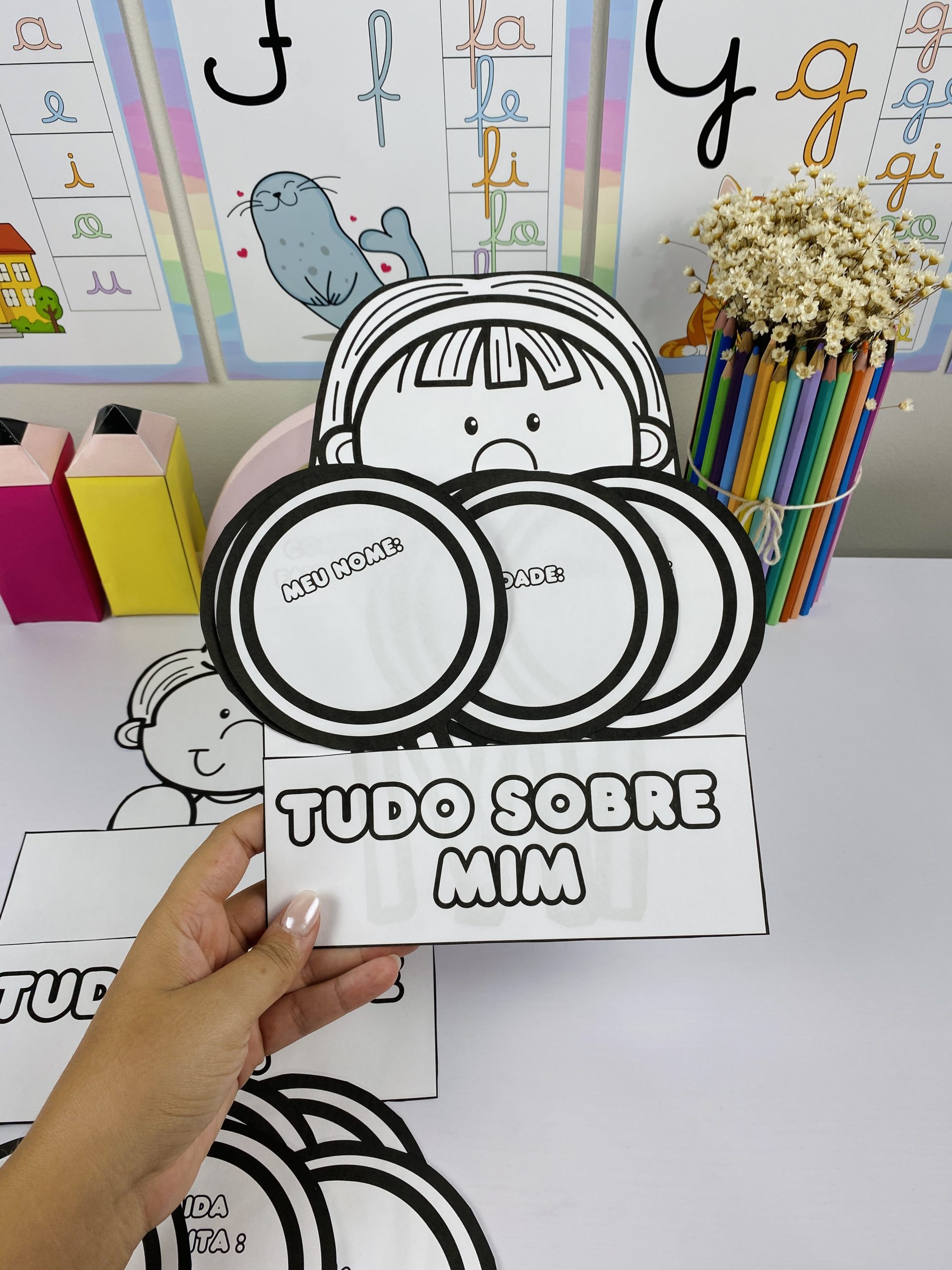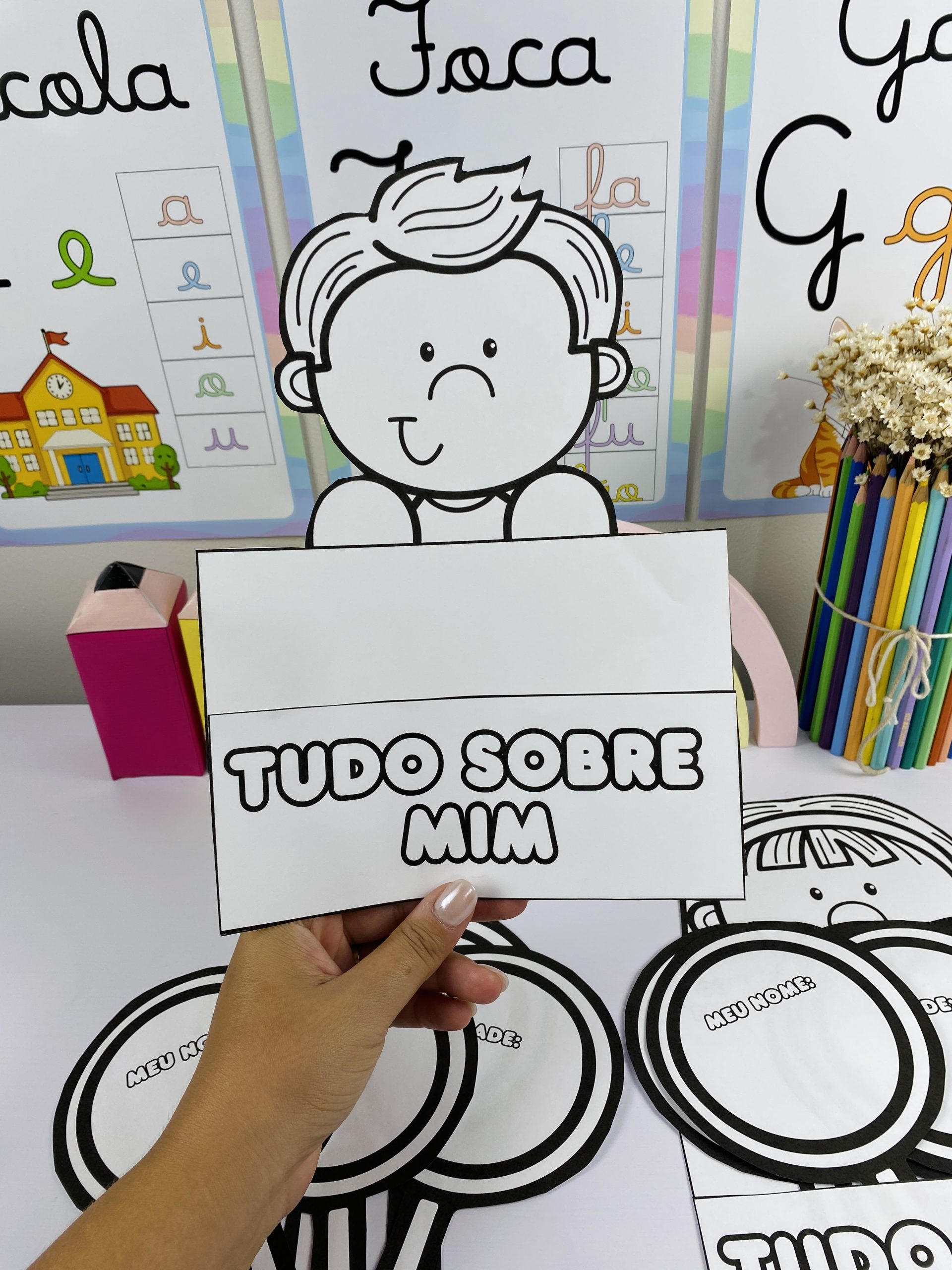 Ideal para Educação Infantil e anos iniciais, perfeita para rodas de conversa, mural da turma ou atividades individuais nos primeiros dias de aula.