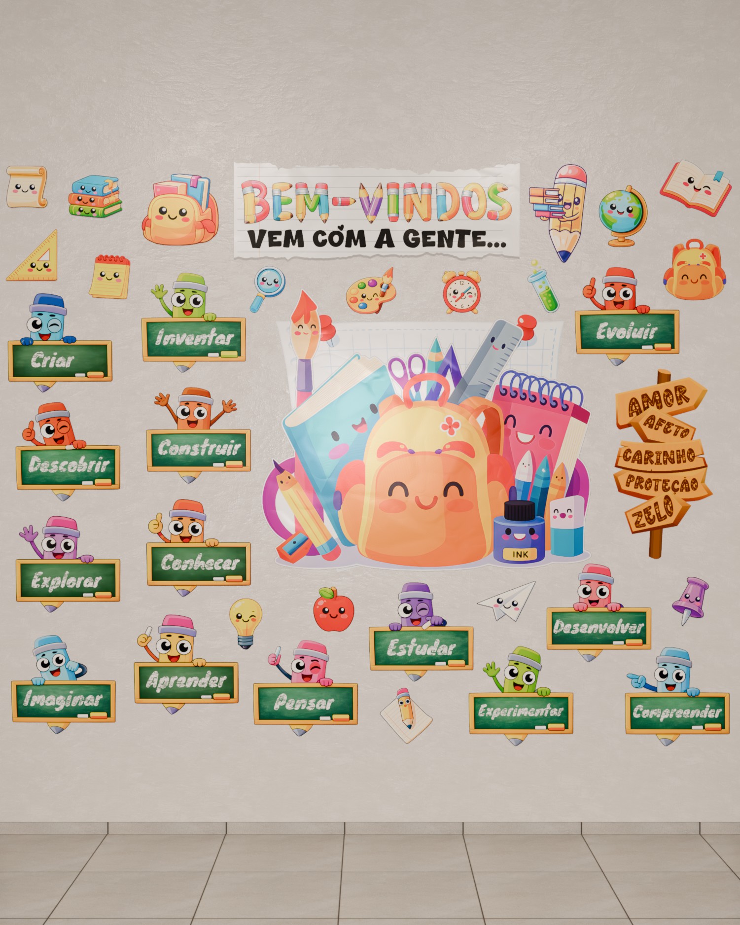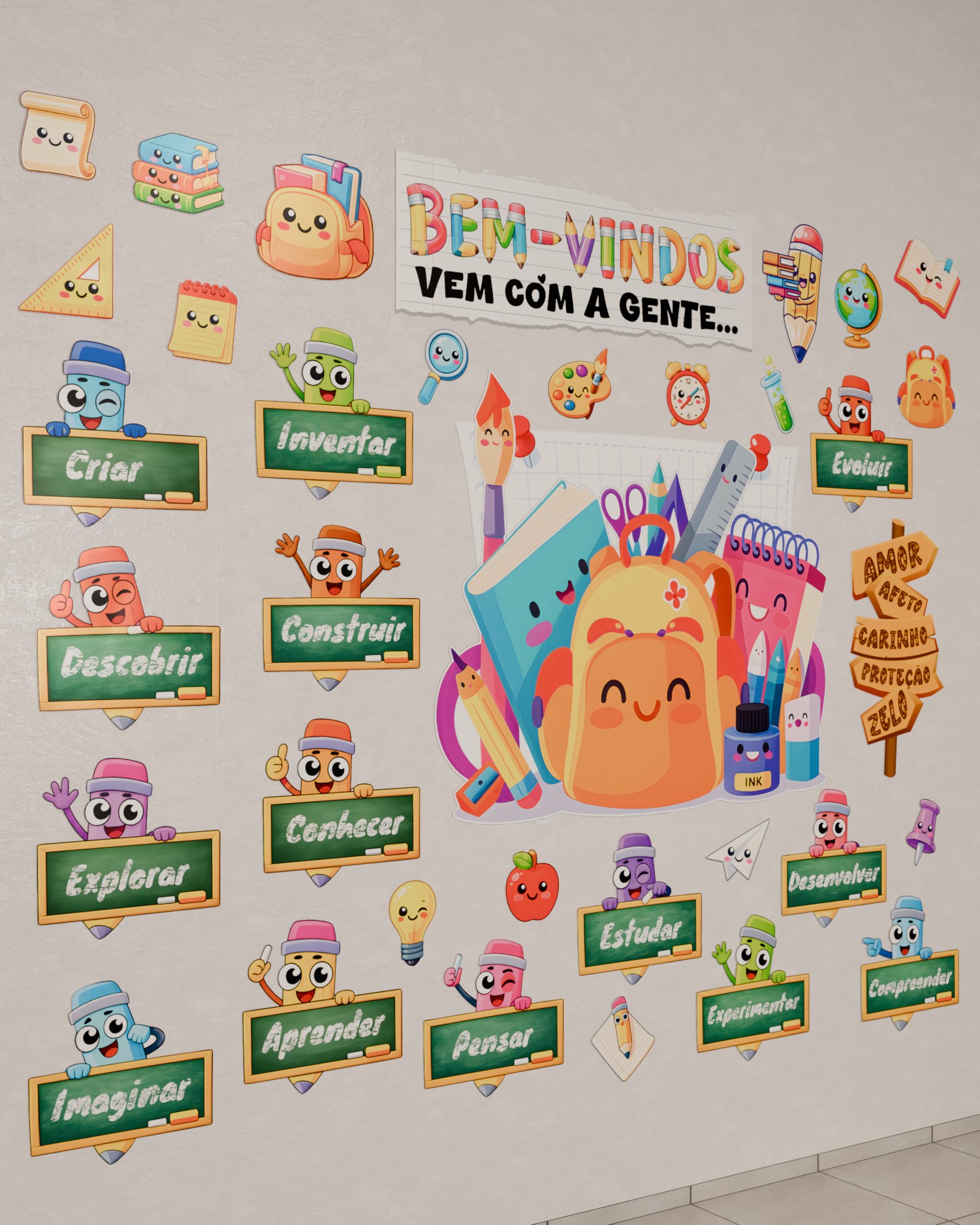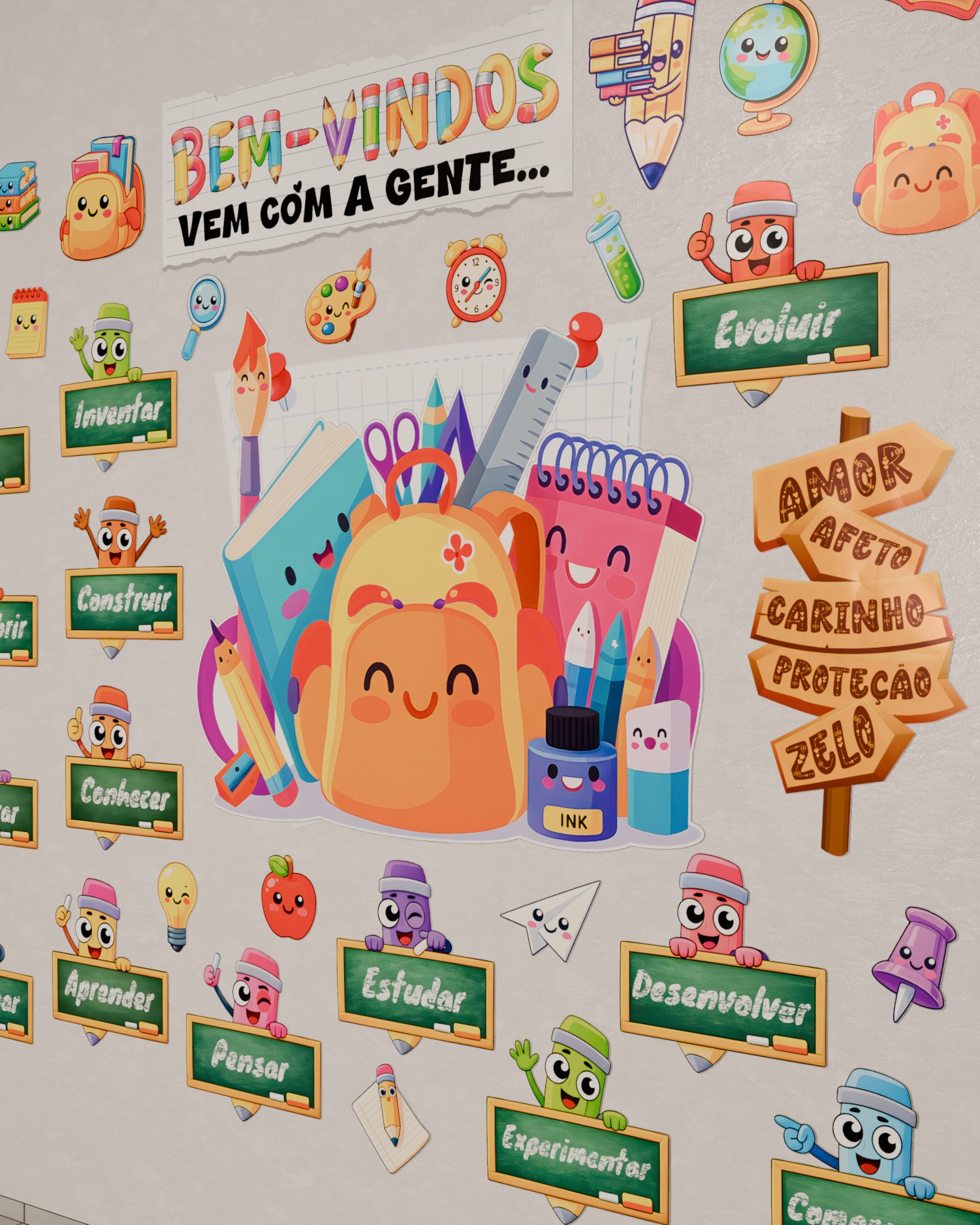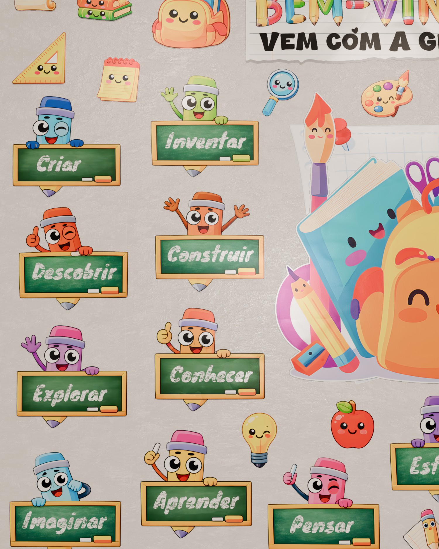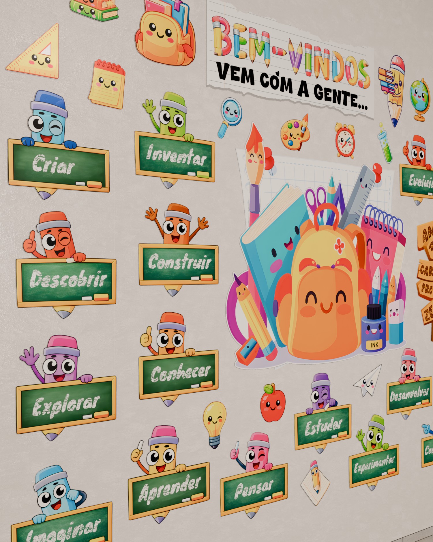 Um painel alegre, colorido e cheio de significado para acolher as crianças no início do ano letivo, incentivando a curiosidade, a criatividade e o amor pelo aprender desde os primeiros dias de aula. Ideal para criar um ambiente positivo, motivador e cheio de boas expectativas.