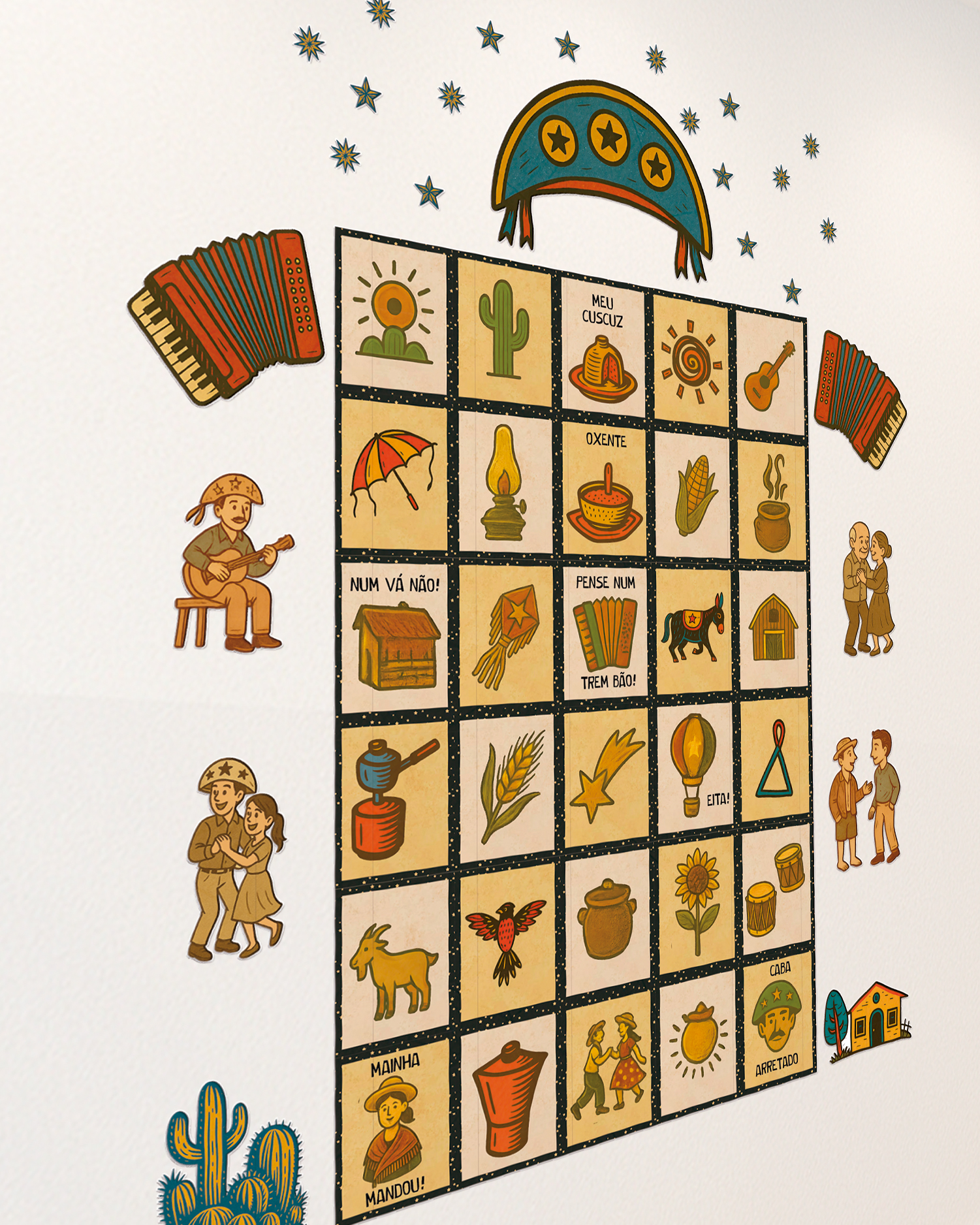 🌵 Ícones nordestinos como cacto, fogueira, milho, cordel, balão e comidas típicas;
