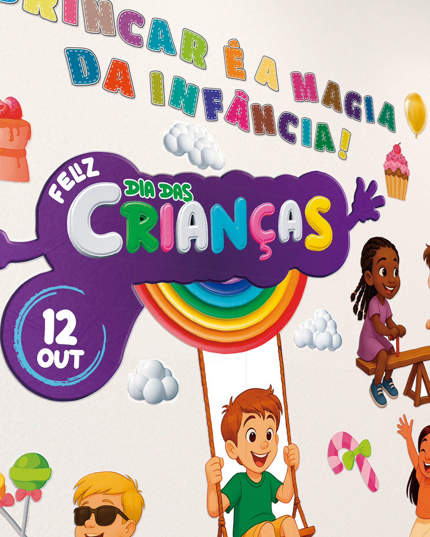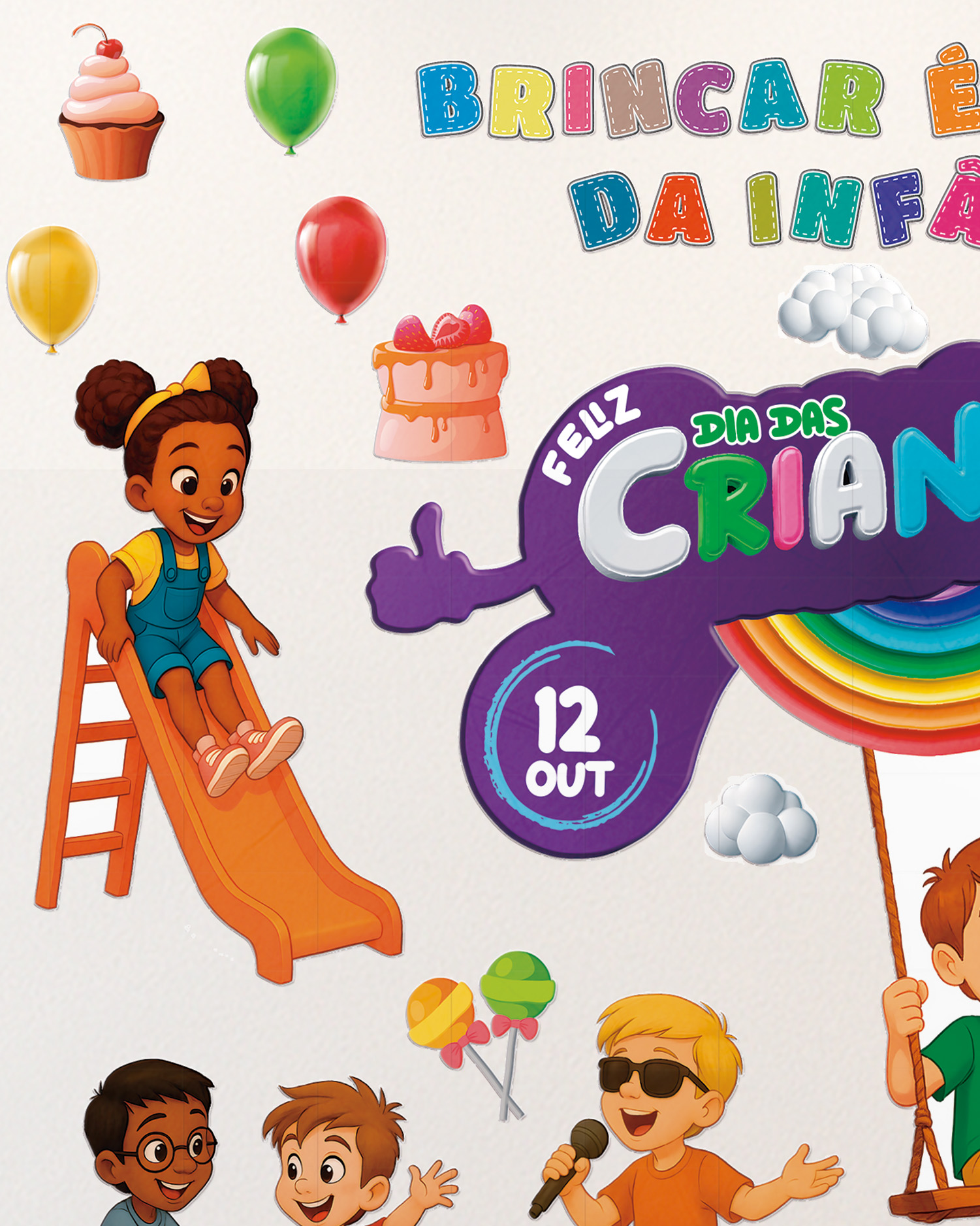 🎨 Elemento central com o texto “Feliz Dia das Crianças – 12 de Outubro”