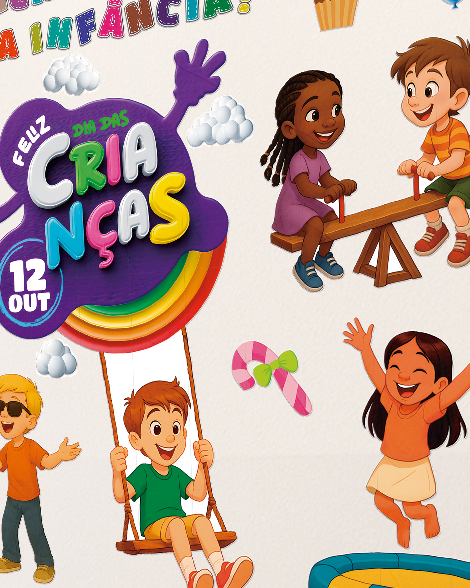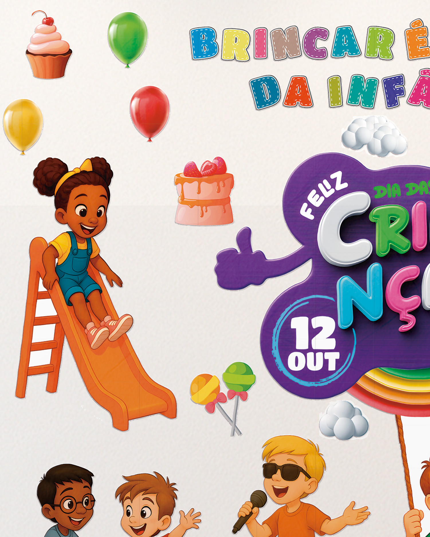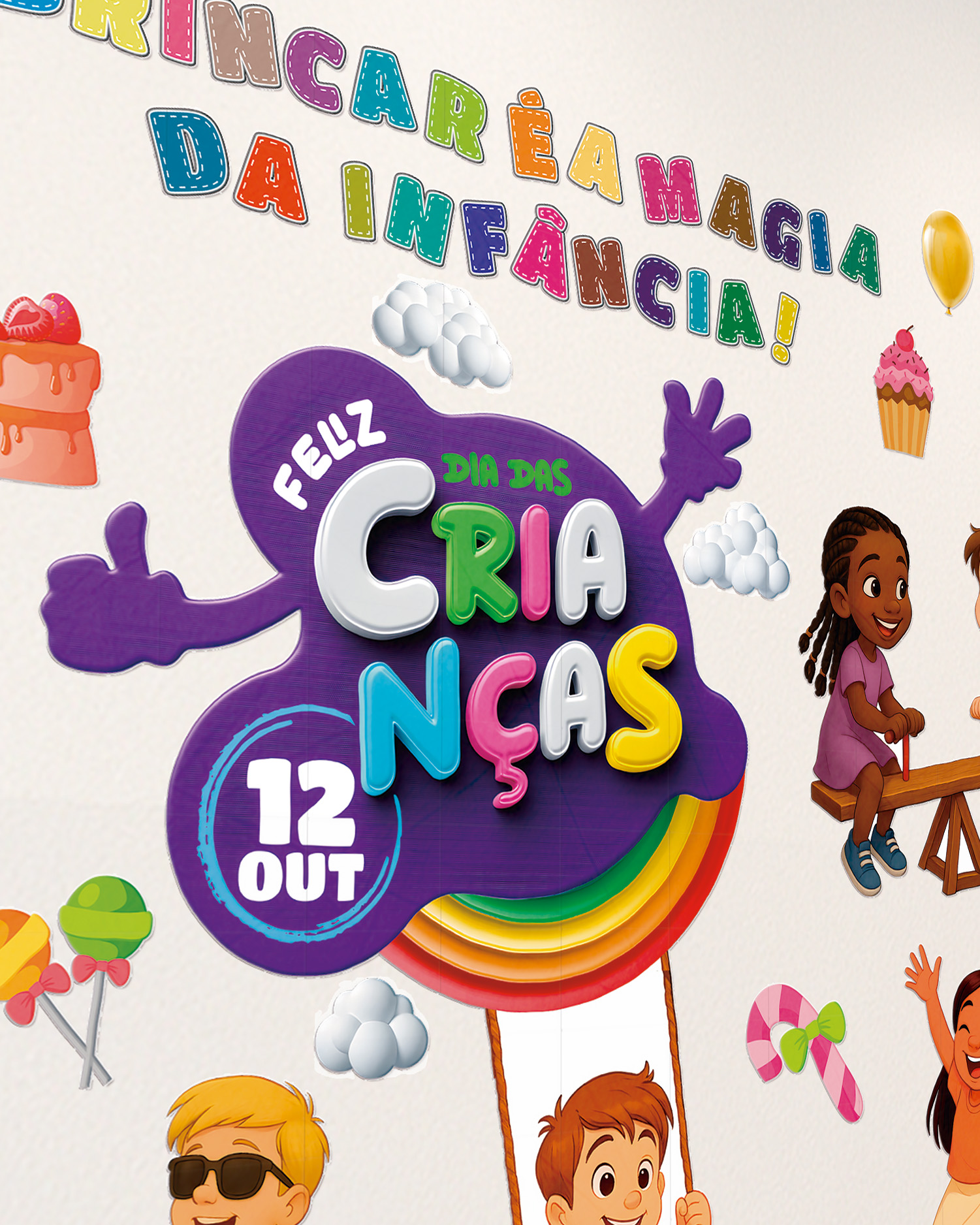 🎨 Elemento central com o texto “Feliz Dia das Crianças – 12 de Outubro”