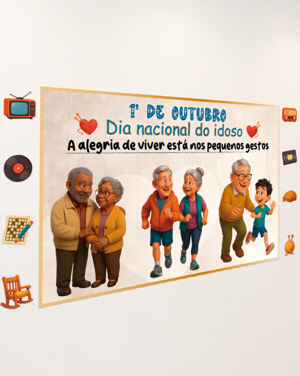 💛 Elementos decorativos ligados ao cotidiano dos idosos (rádio, TV antiga, tricô, disco, etc.);
