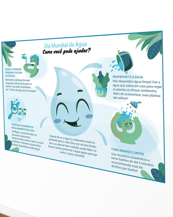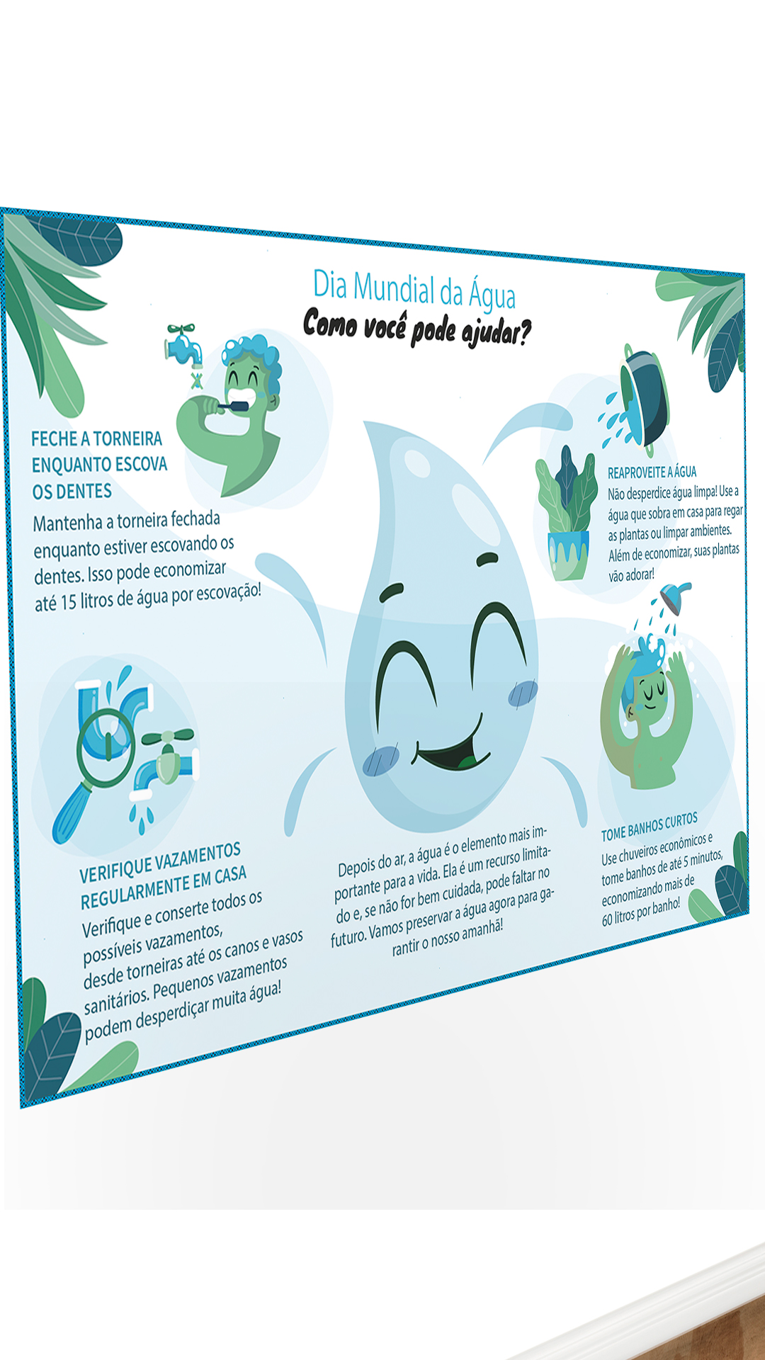 Um lindo painel ilustrado com dicas práticas e divertidas sobre como economizar e preservar a água em nosso dia a dia. Ideal para promover a conscientização ambiental de forma leve e educativa nas escolas!