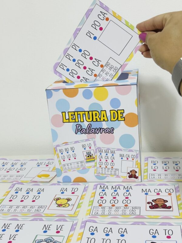 ✅ **Arquivo contém:** Molde da caixa, **32 cartelas** com palavras dissílabas e trissílabas para leitura e **32 fichas com figuras** para associar às palavras.