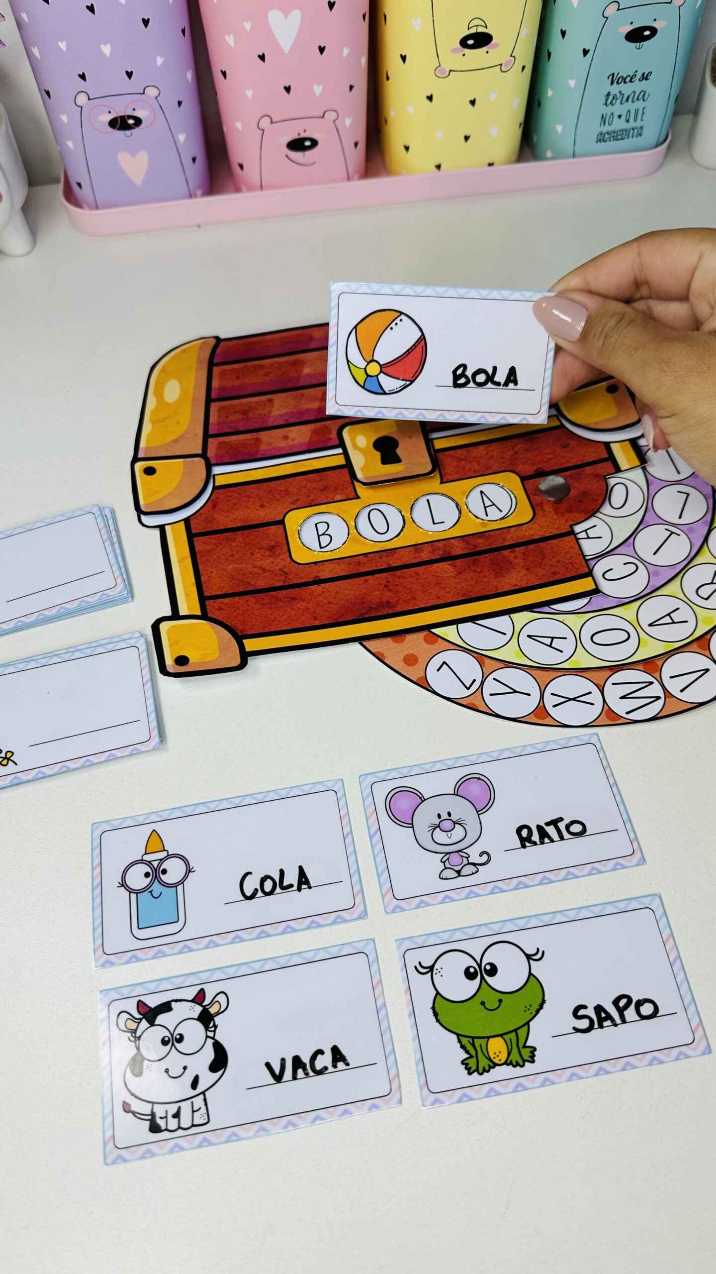 📌 4 roletas com letras e 36 fichas para escrever o nome de cada figura que encontrar no baú.